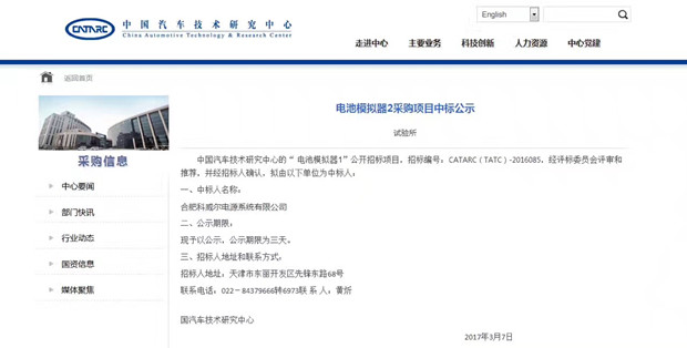 中国汽车技术研究中心2017年3月7日公告,合肥万向娱乐电源系统有限公司中标中国汽车技术研究中心“电池模拟器2”(招标编号:CATARC(TATC)-2015085)、“电池模拟器3”(招标标号:CATARC(TATC)-2015086)项目。